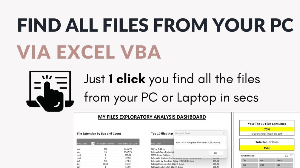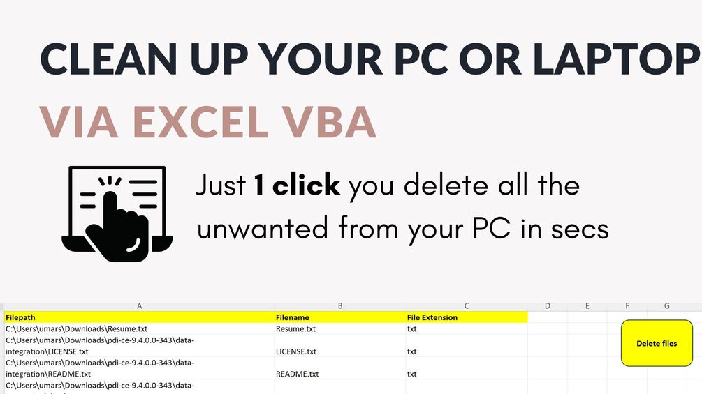 Do you find yourself overwhelmed when searching for specific files on your PC or laptop? Fear not! This excel based tool automates the process of finding files based on a specified path and any unwanted files you can delete in a single click.